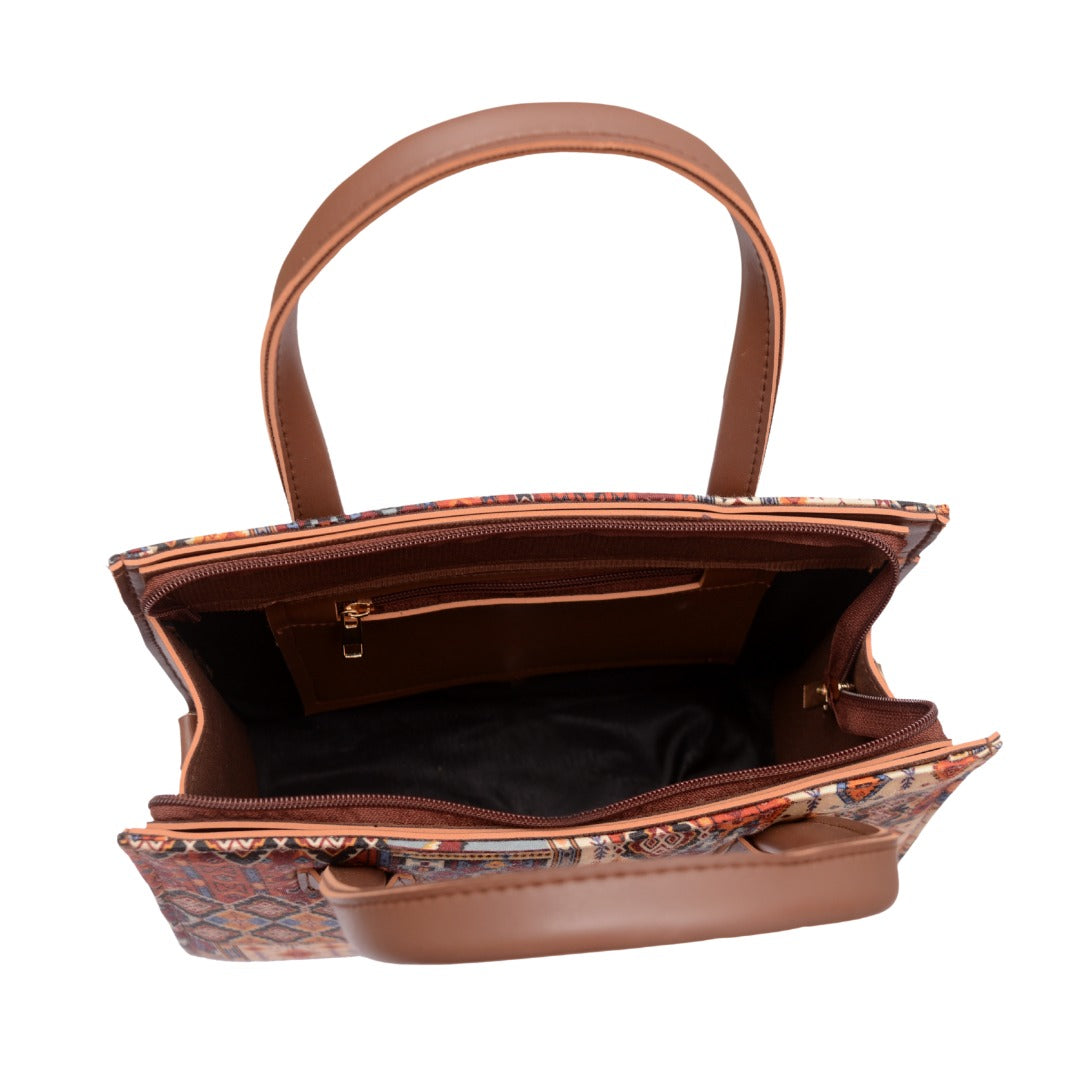 Rich in heritage, the LYM VEMP Terracotta Patchwork Tote showcases detailed patterns inspired by hand-crafted tiles. The warm terracotta and brown tones give it a grounded, earthy appeal. With its spacious design and comfortable handles, this tote blends tradition with modern elegance.